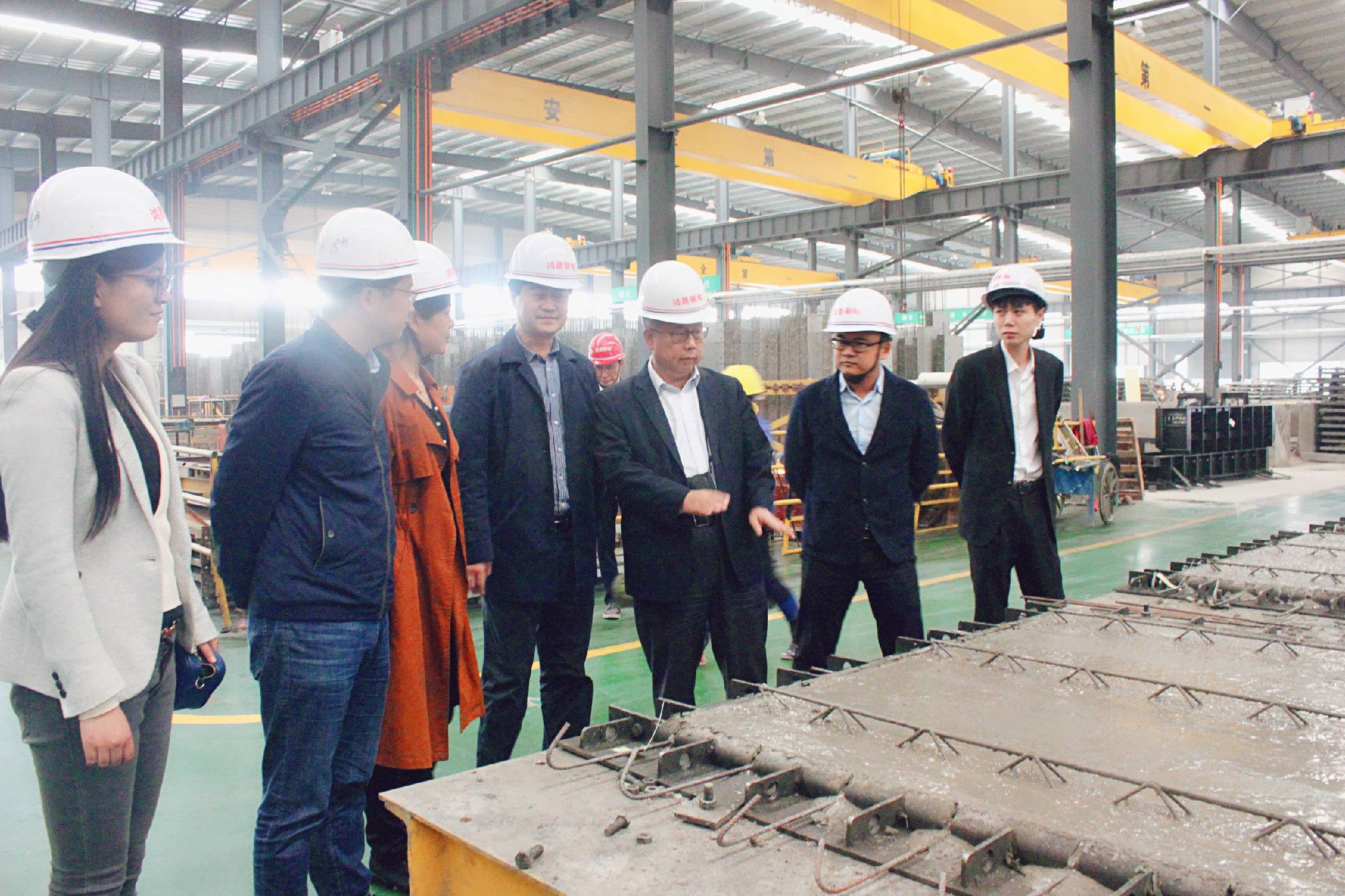 在王總、孫總的陪同下,觀看了鴻路宣傳片并實地來到位于公司旁邊的安徽最大的裝配式建筑鳳棲苑項目現(xiàn)場,聽取了裝配式建筑情況介紹。其后又陸續(xù)到公司的JCOE制管加工車間、PC構件的生產(chǎn)車間、智能化生產(chǎn)車間等生產(chǎn)加工車間各環(huán)節(jié)參觀。