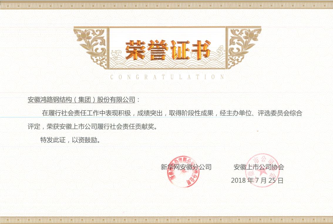 在本次論壇上,為表彰在履行社會(huì)責(zé)任方面作出突出貢獻(xiàn)的上市公司,經(jīng)過評(píng)選,揭曉了“安徽上市公司社會(huì)責(zé)任論壇”貢獻(xiàn)獎(jiǎng)名單,安徽鴻路鋼結(jié)構(gòu)(集團(tuán))股份有限公司名列其中,并頒發(fā)榮譽(yù)證書和獎(jiǎng)杯。