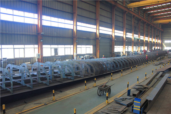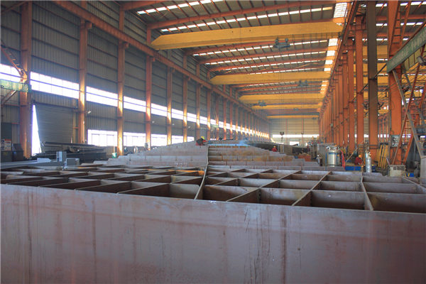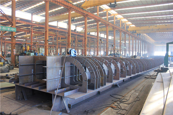 目前工廠在做的雙墩路人行天橋,布置在雙墩路附近,天橋平面呈弧形。主橋橋?qū)?.4m,梯道橋?qū)挒?.5m、3.0m;主梁跨徑采用三跨連續(xù)鋼箱梁,其跨徑為(19+34+31)m,天橋主橋全長(zhǎng)87.764m,梁高 1.4m,在工廠分三段加工預(yù)制。人行梯道采用鋼箱梁,梯道梁高為 0.4m。梯道踏板采用焊接鋼板,梯道鋼箱梁支撐在主梁牛腿上。主梁采用 Q345qC 鋼材,梯道采用 Q235B 鋼材制作。
